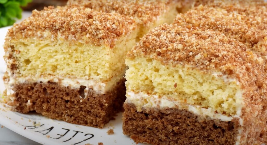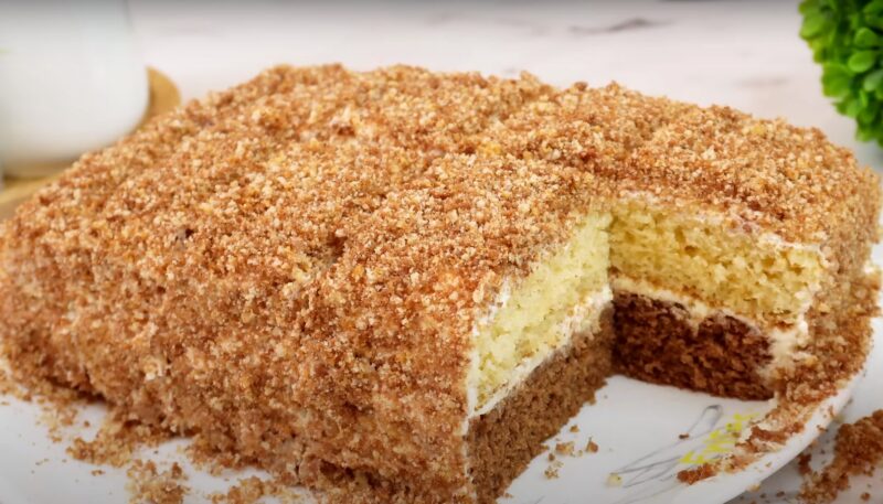 Из остатков коржа делаем крошку, покрываем ей бока кремового пирога. Оставляем пирог на 20 минут при комнатной температуре для пропитки.