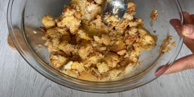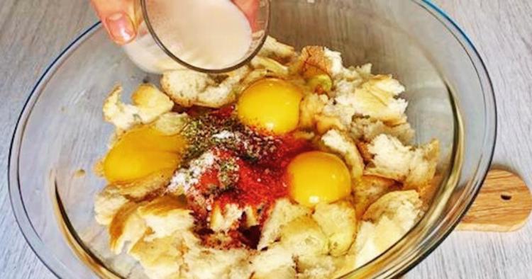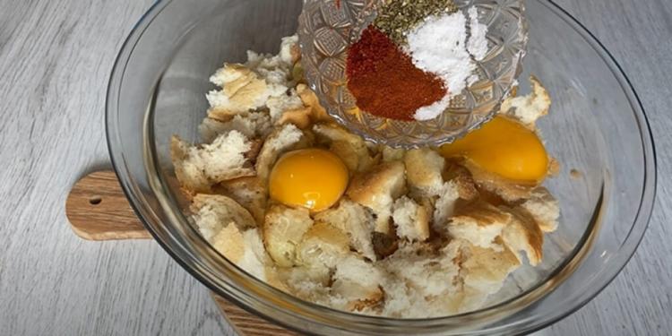 Хліб ламаємо невеликими шматочками. Додаємо до них яйця, молоко, спеції та сіль.