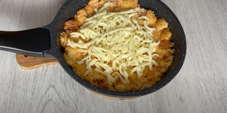 Олією змащуємо сковорідку. Викладаємо в неї половинку хлібної маси. Посипаємо натертим сиром.