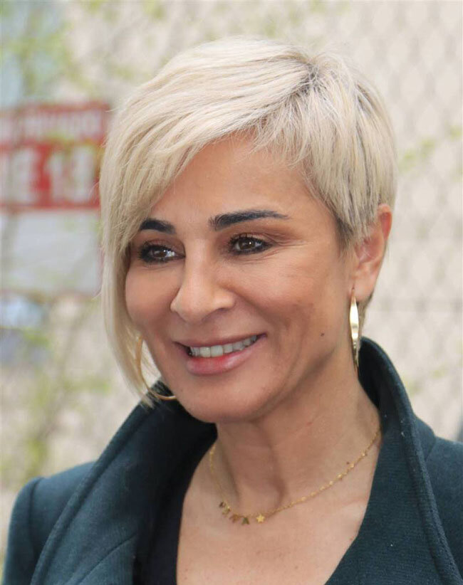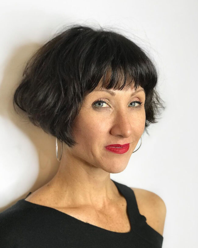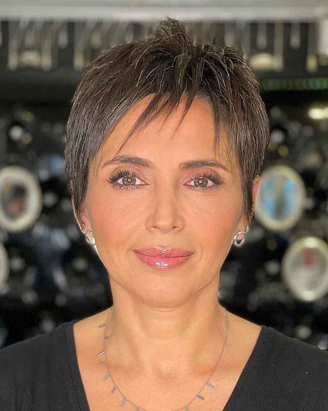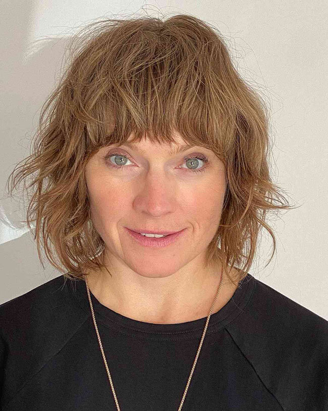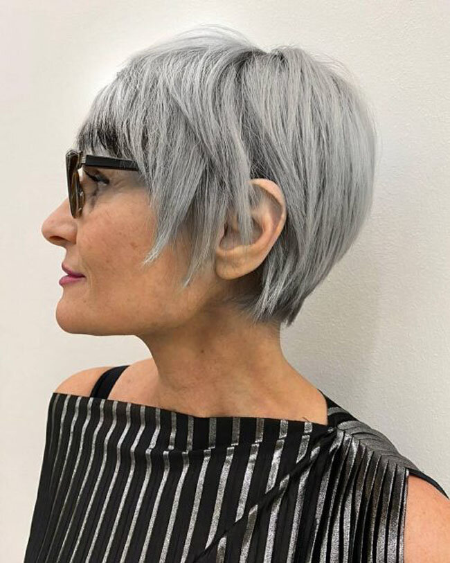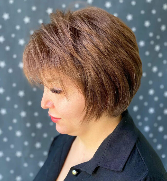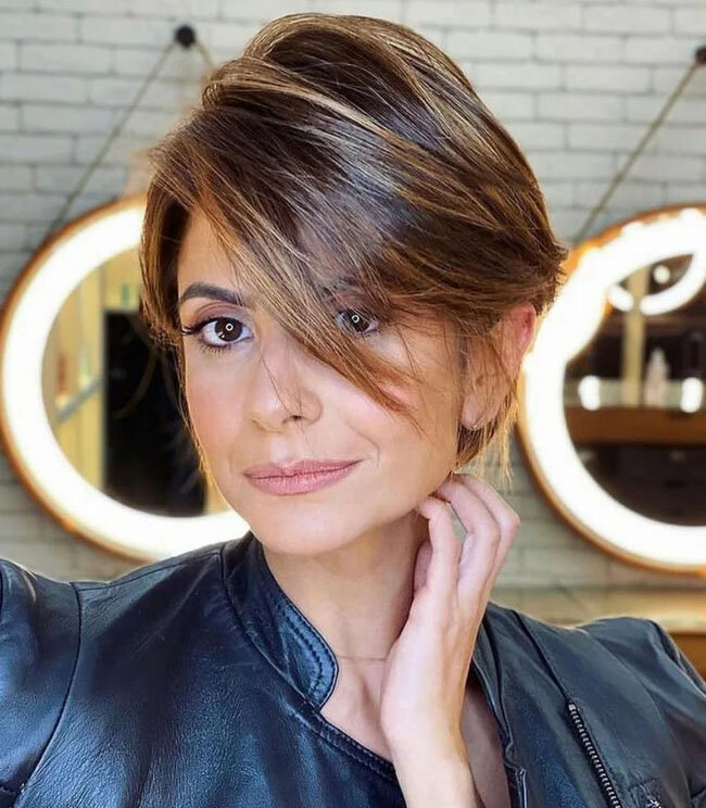 Пикси с длинной челкой — помогает скрыть морщины на лбу, хотя может быть неудобной, если челка постоянно падает на глаза.