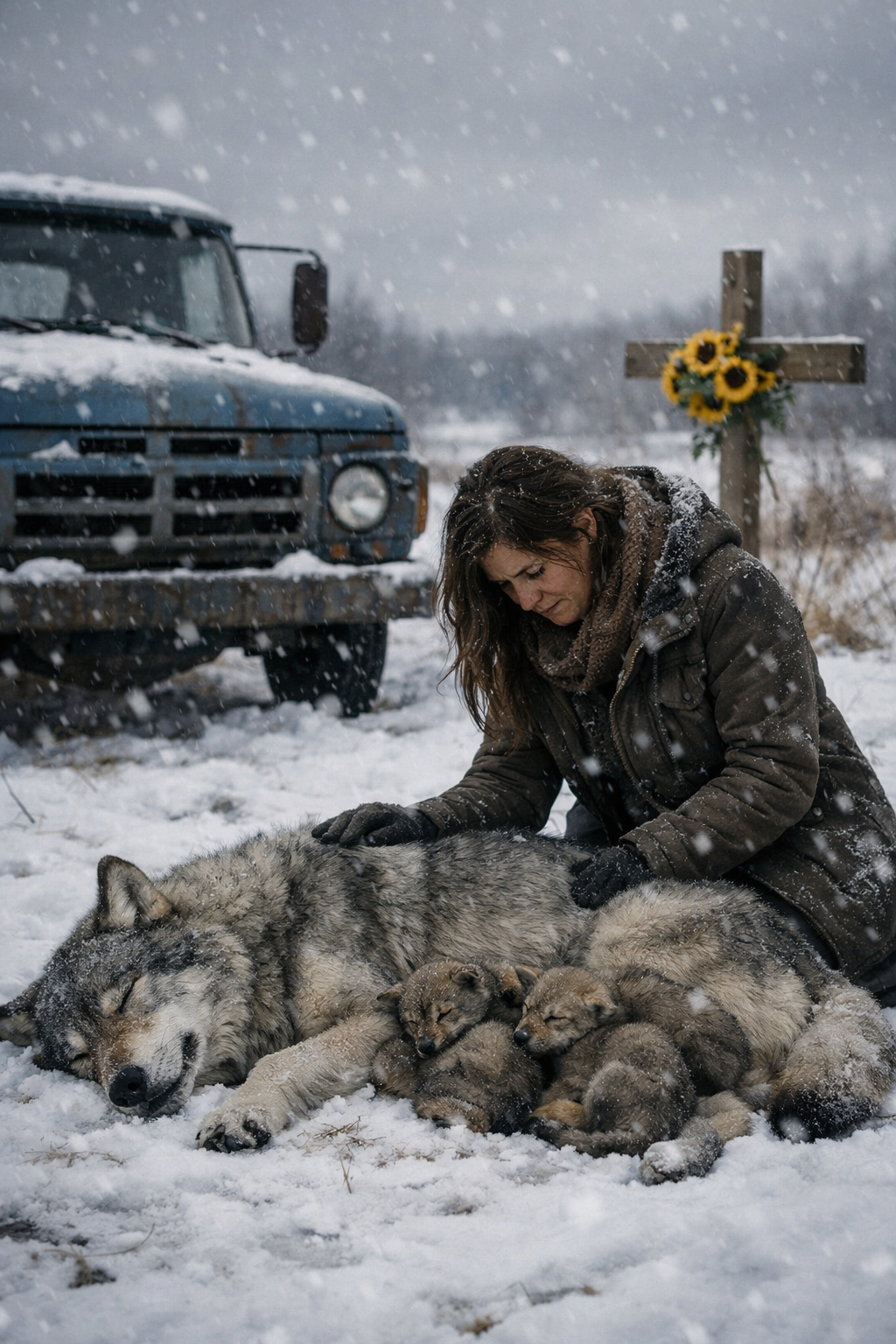 Молодая женщина по дороге домой заметила замёрзшую волчицу, а рядом с ней — маленьких волчат, которые дрожали от холода и страха