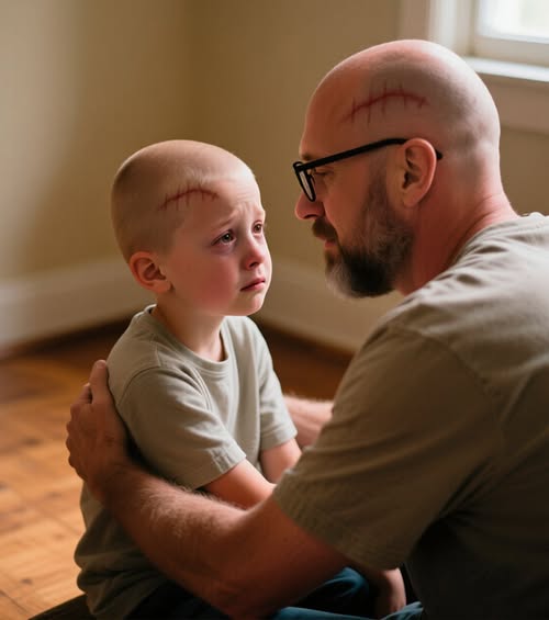 Папа, у тебя такой же шрам! Отец поддержал своего восьмилетнего сына после тяжёлой операции и огромного шрама на голове.