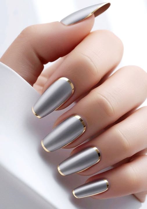 Сірий манікюр з тонкою золотою окантовкою. Він виглядає дорого, мінімалістично й водночас дуже ефектно