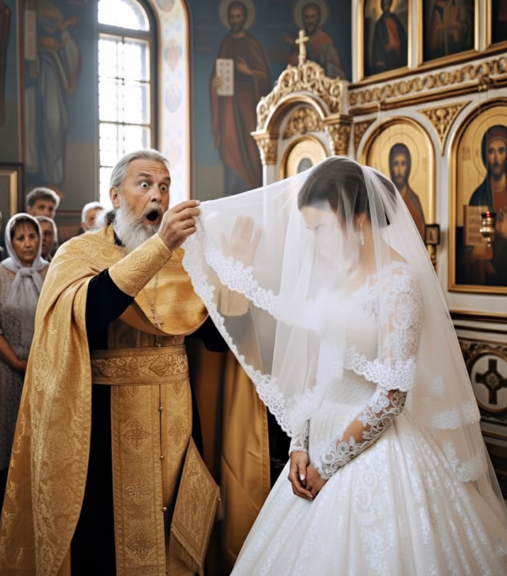 Во время свадьбы, когда жених поднял фату невесты, священник вдруг резко сказал: “Церемонию нужно прервать”