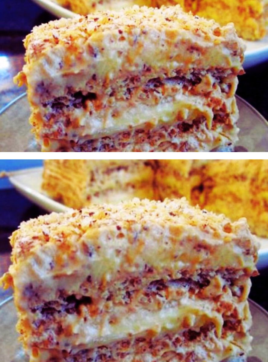 Собирайте торт, чередуя слои: корж, крем, хрустящая прослойка. Повторяйте до использования всех ингредиентов. Завершите сборку, посыпав торт измельченными орехами сверху.