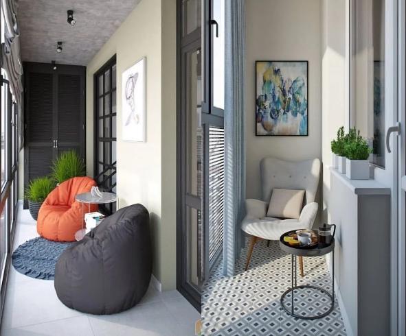 Сделать из балкона атмосферную лаундж-зону проще простого. Достаточно, например, постелить мягкий коврик, поставить парочку пуфиков или кресел и небольшой столик. На такой балкон будет приятно выйти с чашкой кофе, почитать любимую книгу и просто отдохнуть от суеты.