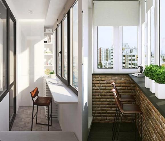 Очень простой в исполнении вариант обустройства балкона. Понадобится всего пара барных стульев и подоконник-столешница.
