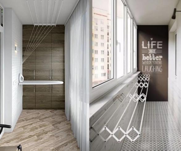Как правило, сушилка в комнате занимает немало пространства и, к тому же, выглядит не очень эстетично. Зато расположить ее на балконе вместе с гладильной доской — отличный вариант экономии места.