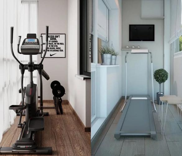 На среднем балконе вполне могут поместиться пара небольших тренажеров, которые в комнатах не всегда есть куда поставить. Если вы любители зарядок, растяжек или йоги, то достаточно постелить на балконе спортивный коврик и делать привычные упражнения глядя на вид из окна.