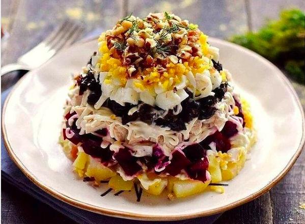 Следующим после чернослива будет слой из белков яиц, промазываем майонезом. Верхушку салата делаем из желтков и мелко порезанных орехов.