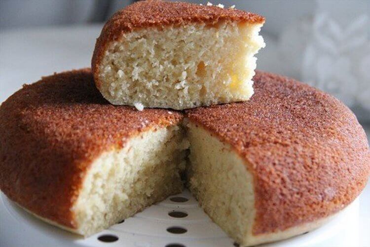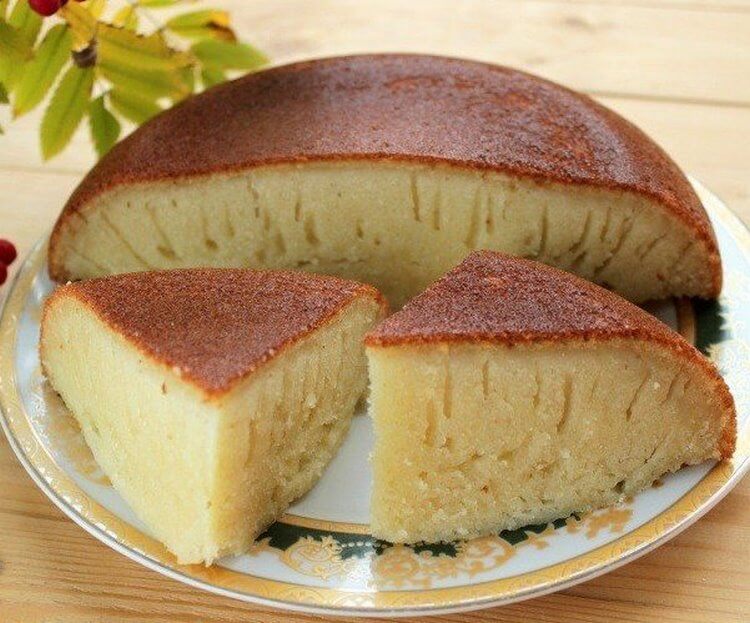 Пробовала делать на соде, мне не понравилось, лучше приобрести разрыхлитель или приготовить его самостоятельно.Форму для пирога выстелем пергаментной бумагой, смажем маслом, присыплем сухарями. Силиконовую форму достаточно просто смазать топлёным маслом или сливочным маргарином. Выльем тесто в форму для пирога.Отправим в заранее прогретую духовку. Температура в печи не более 200 градусов. Верх у манника всегда бледнее, чем низ, поэтому пусть вас не обманет не подрумянившийся верх, через 15-20 минут проверьте спичкой или зубочисткой на готовность, если спичка сухая – вынимайте. Готовый пирог выложим на блюдо, присыплем сахарной пудрой.