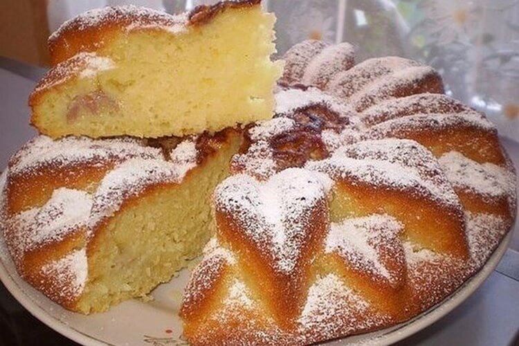 Получившееся тесто выкладываем в форму ( у меня диаметр формы 22 см). Ставим пирог выпекаться в разогретую до 180 градусов духовку на 35-40 минут. Готовность проверяем деревянной шпажкой или зубочисткой. Для этого просто протыкаем пирог в серединке, если зубочистка сухая, значит пирог готов. Даём остыть в форме. Достаём пирог их формы и присыпаем сахарной пудрой. Вкусный, мягкий, рассыпчатый и нежный пирог готов!