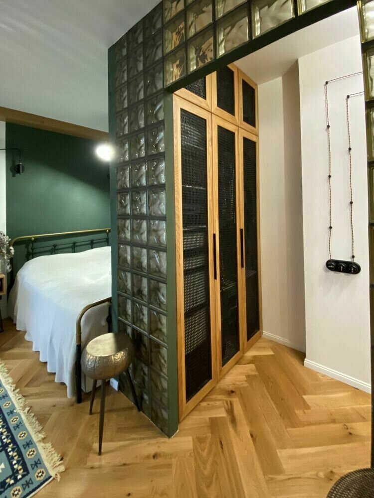 Спальня оформлена в углублении помещения. Стены в природном оттенке с зеленым акцентом для визуального разделения. Над кроватью стильные приборы освещения.