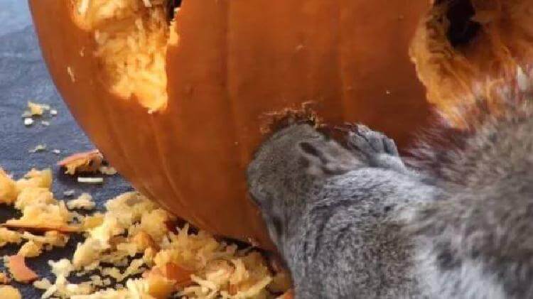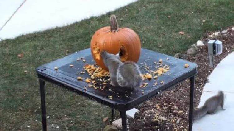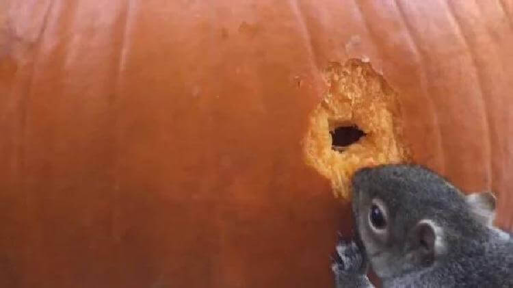 Владелец дома увидел, что в его саду поселилась белочка, и решил провести эксперимент. Он взял из огорода тыкву, поставил ее на уличный столик и установил скрытую камеру. Ему интересно было, что же будет делать зверек.