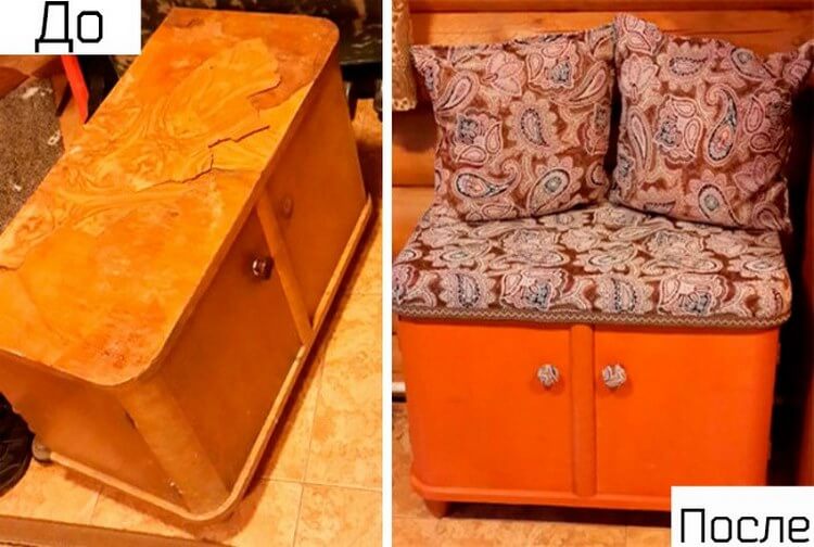 Старую тумбу советского образца можно превратить в удобный компактный диванчик с мягким сиденьем и местом для хранения обуви.
