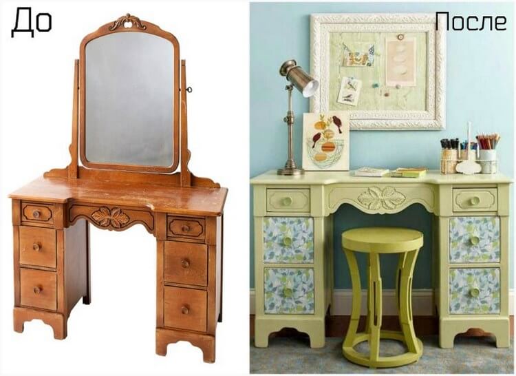 Новый свежий цвет, декупаж выдвижных шкафчиков и демонтаж большого зеркала позволили превратить этот громоздкий и устаревший туалетный столик в очаровательный письменный стол.