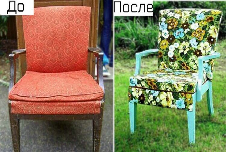 Вдохнуть новую жизнь в старое невзрачное кресло поможет незначительная покраска некоторых его деталей и перетяжка подушек плотной тканью с красивым принтом.