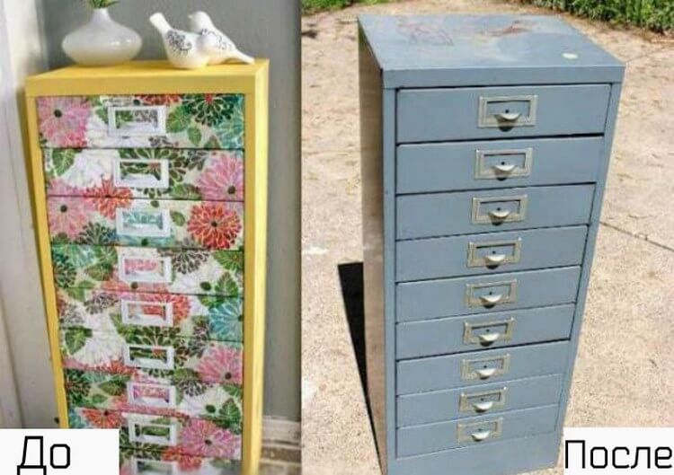 Аккуратная покраска и декупаж выдвижных ящиков позволили придать этому потертому и выдавшему виды комоды новый, современный вид.