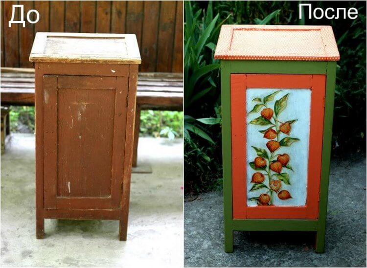 Потрясающая трансформация ненужной тумбы советского образца в новый яркий предмет мебели, которую удалось произвести путем снятия дверцы и аккуратной покраски.