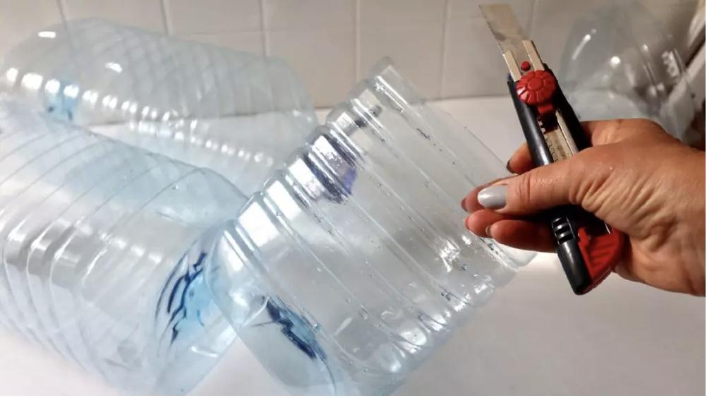 Аккуратно отрежьте верхнюю часть каждой бутылки.
