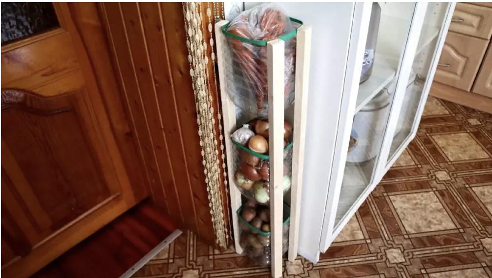 Получилась компактная и удобная вертикальная полка для овощей. В нее поместится недельный запас, а места приспособление займет совсем немного.