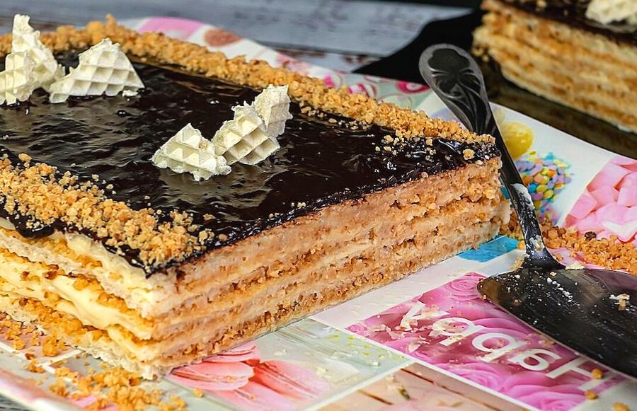 Дальше выкладываете слой крошки. Сверху еще раз наносите крем. Затем кладете еще один вафельный лист и все повторяете снова. Когда перемажете все коржи, то ставите торт в холодильник на пару часов.