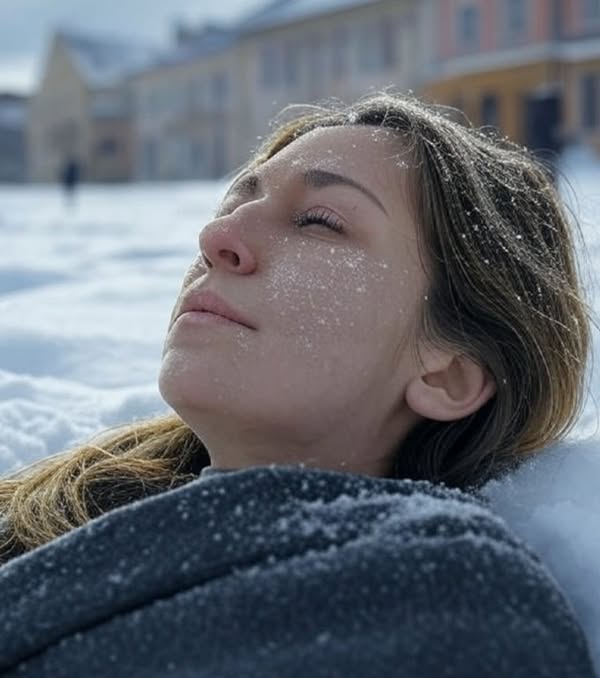 Она лежала в сугробе на окраине главной площади. Снег облепил её волосы, лицо побледнело от холода, глаза были закрыты. Её лёгкое дыхание почти терялось в морозном воздухе. Прохожие, занятые своими делами, проходили мимо, не замечая её. Кто-то украдкой смотрел, но не останавливался.