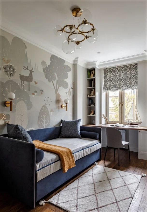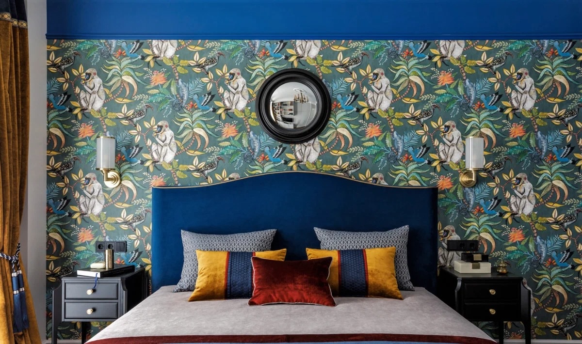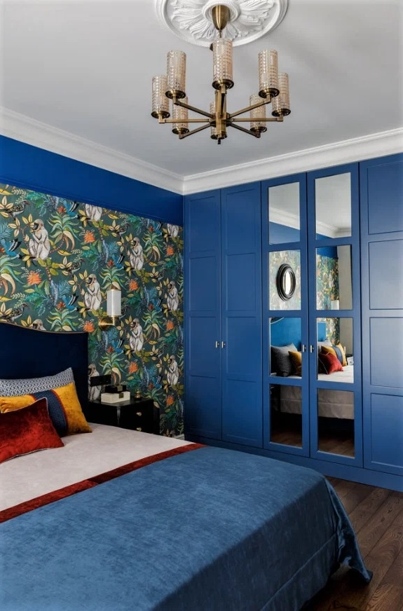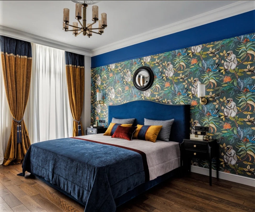 Спальня приобрела новый облик с синим цветом и яркими обоями на стене.