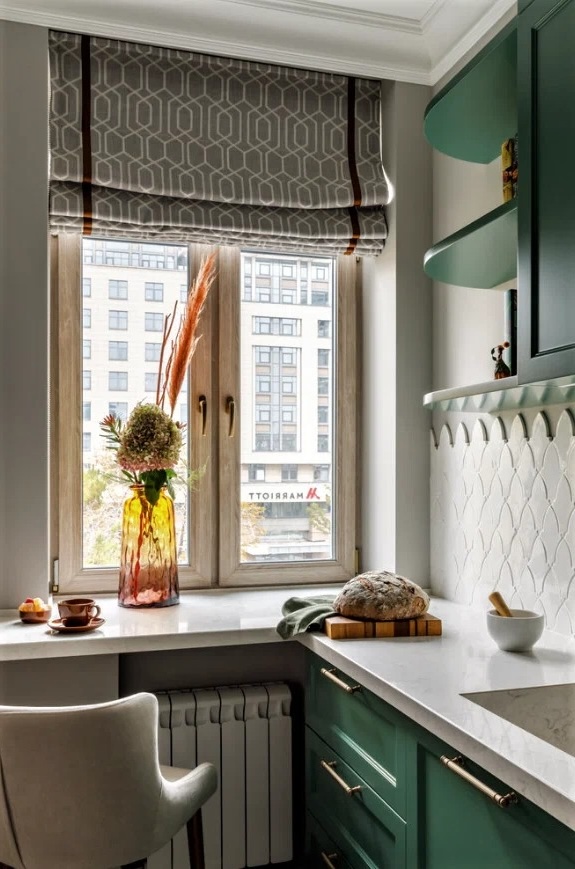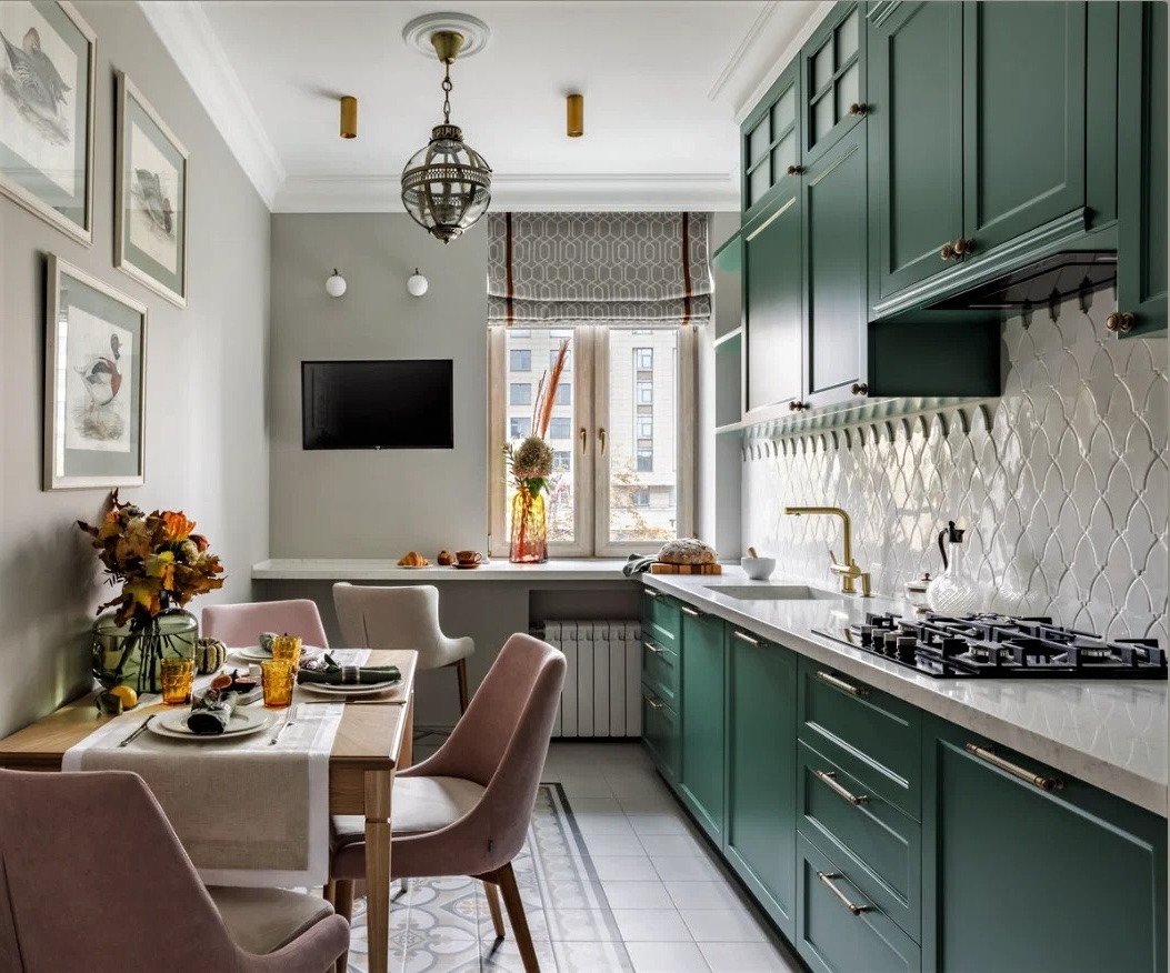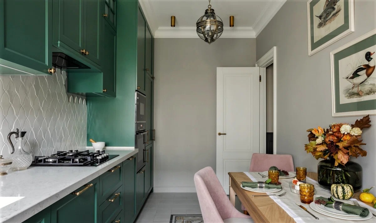 Кухня претерпела перемены, благодаря насыщенному зеленому цвету и новой столовой зоне.
