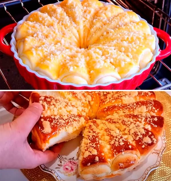 Форму диаметром 28 см смазываю масло. Выкладываю треугольники по кругу, накрываю крышкой отдохнуть на 15 минут. Тогда смазываю взбитым желтком и посыпаю крошкой. Отправляю в духовку при температуре 165 градусов на 35-45 минут.