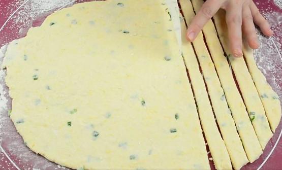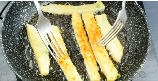 Нарежьте тесто на полоски и обжаривайте их с обеих сторон на сковороде с разогретым растительным маслом до золотистой корки.