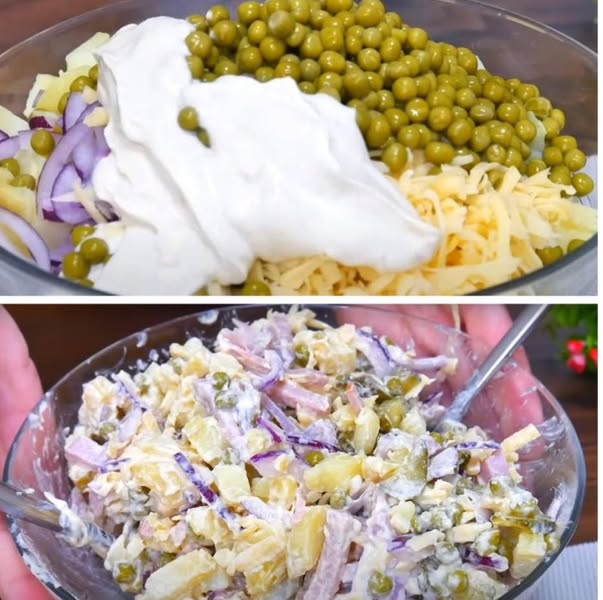 Приготовление картофельного салата: Нарезаем маленькими брусочками копченую колбасу. Режем маринованные огурцы полукольцами, а красный лук — четверть кольцами. Отвариваем до мягкости картофель и очищаем от кожуры. Нарезаем картофель маленькими кубиками, выкладываем в салатник вместе с колбасой, огурцами, луком и зеленым горошком.