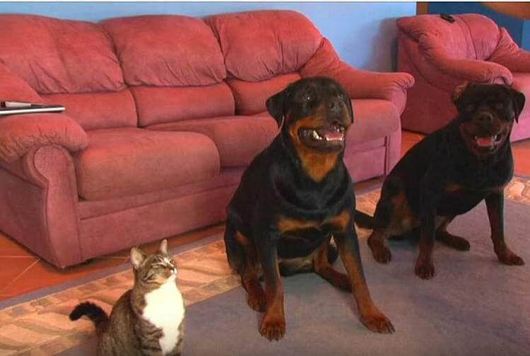Посмотрите это потрясающее видео с кошечкой, сидящей рядом с двумя ротвейлерами, которая может делать те же трюки, что исполняют собаки!