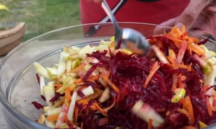 Зʼєднуємо разом моркву, буряк та яблуко. Додаємо до них заливку, перемішуємо та прикрашаємо петрушкою дрібно нарізаною.