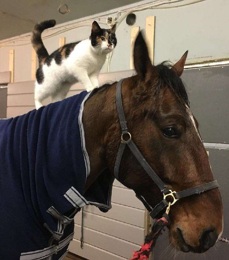 Хозяина кошечки зовут Матиас Сало, он тренер по скачкам. Его пушистый питомец умеет не только оседлать лошадь, но и радушно встретить двуногих посетителей.