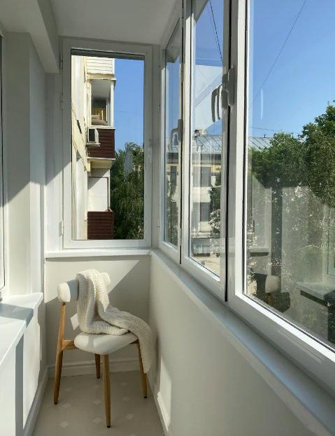 Высота потолка стала одинаковой со всем остальным пространством, равной 2,5 метра. Балкон был застеклен и отделан в том же стиле и цвете.