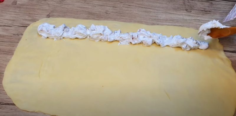 На одной его сторону выкладываем начинку, сворачиваем рулет.