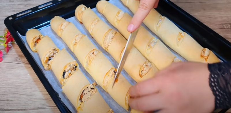 Противень застилаем пергаментом, выкладываем рулеты и на каждом делаем сверху надрезы, чтобы после выпекания по ним можно было нарезать порционное печенье и не поломать хрупкое тесто.