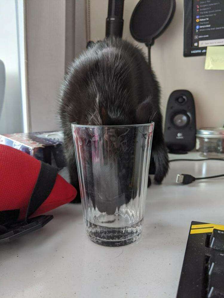 Зачем ему миска, если его голова легко пролезает в хозяйский стакан