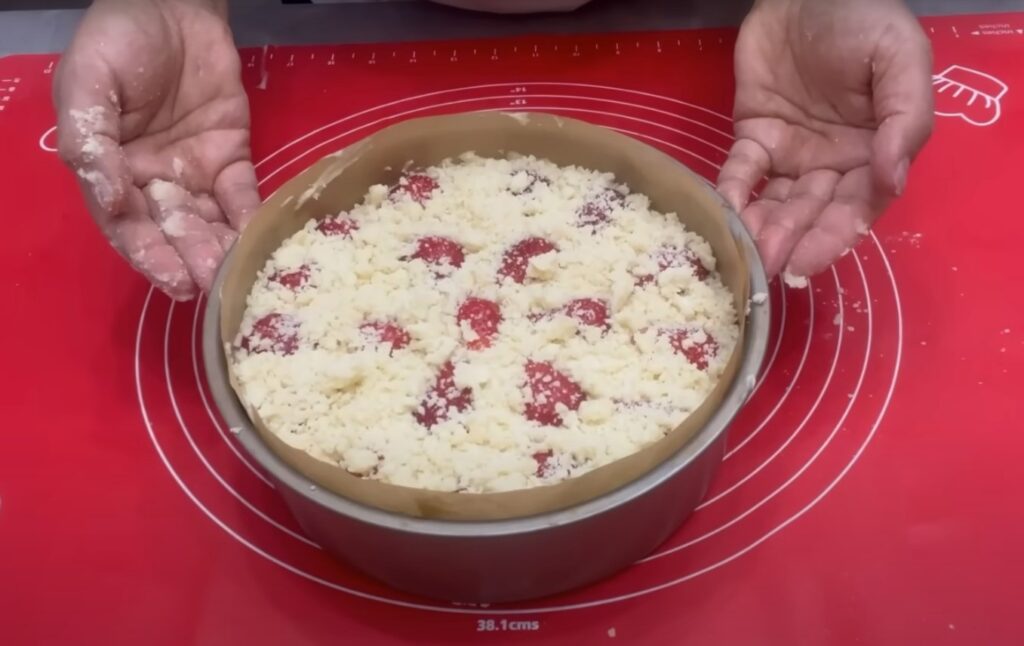 Застеляємо форму для випікання пергаментом і викладаємо в неї тісто, розподіляємо по дну. Можна відкласти частину полуниці, розділити кожну на 2 половинки і викласти на верхівку тіста візерунком.