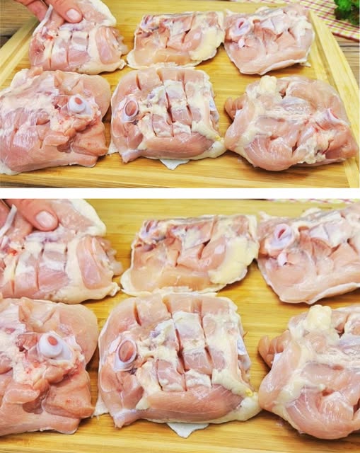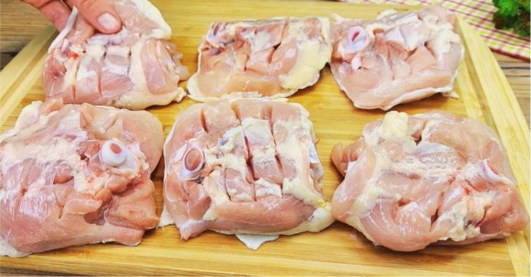 1. Зробіть надрізи на курячих стегенцях з обох боків. Посипте їх сіллю та приправою для м’яса.