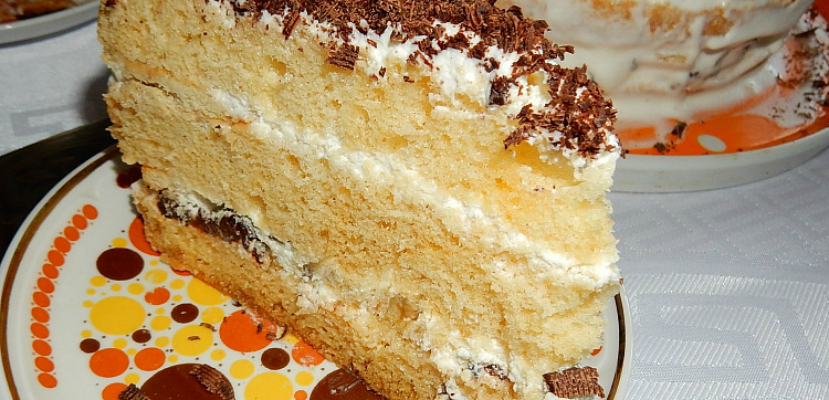 - Починайте збирати торт. Кожен корж гарно намастіть сметанним кремом. Торт повинен бути повністю намазаний кремом. Прикрасите можна какао, горішками або шоколадом.