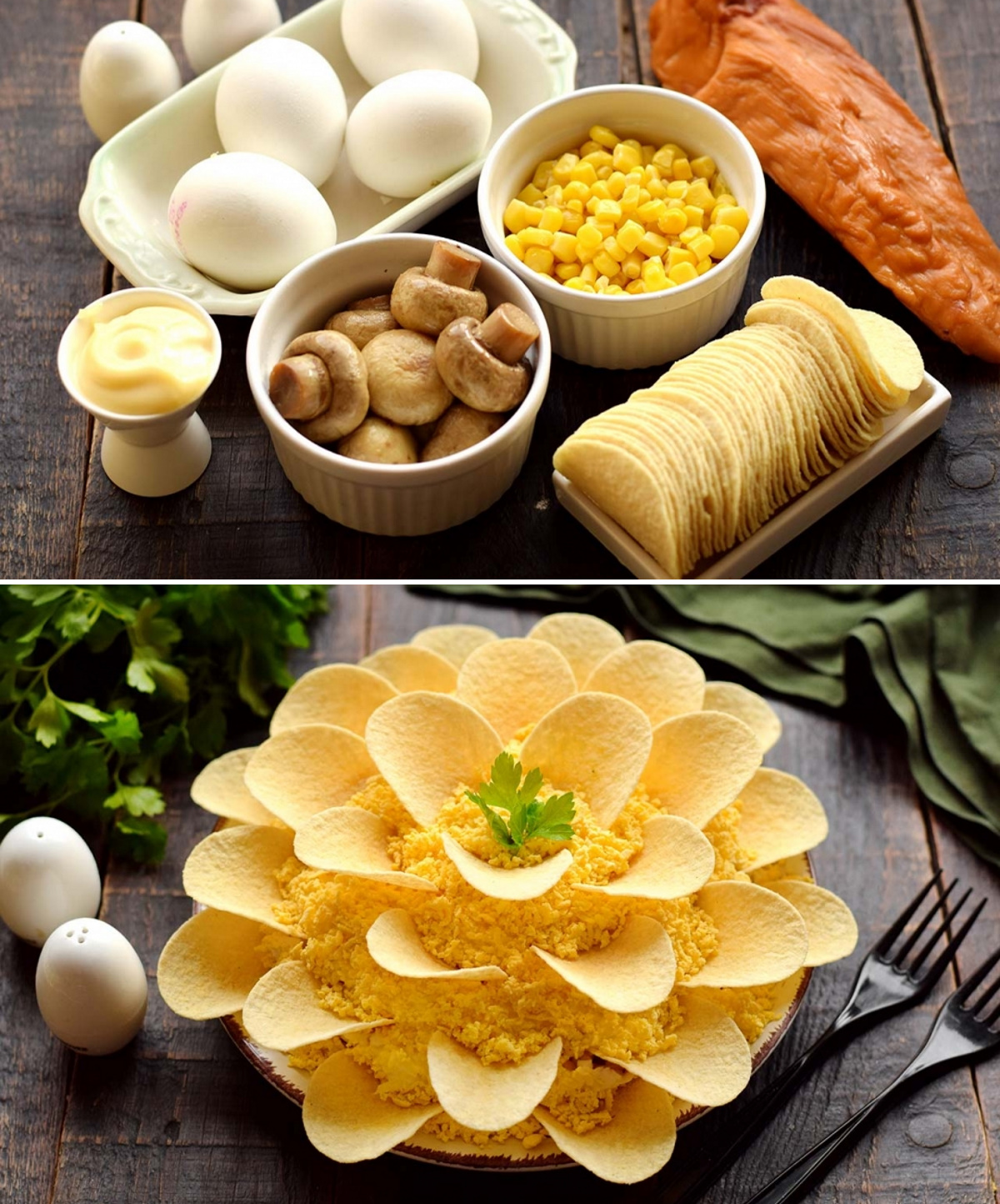- Заранее подготовьте все компоненты: отварите яйца, слейте маринад с грибов, удалите лишнюю жидкость из кукурузы.