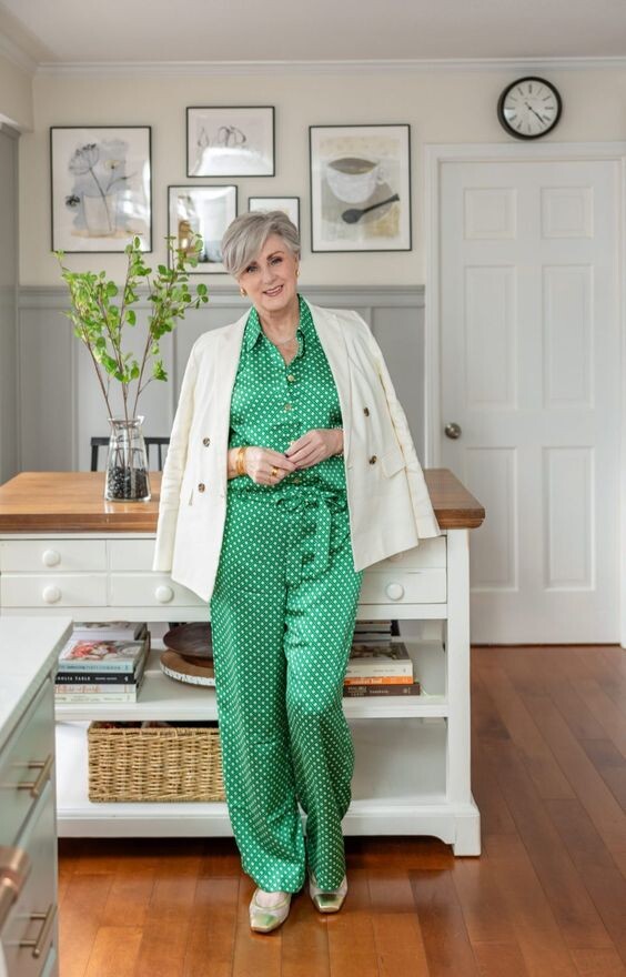 Світло-зелений костюм у білий горошок виглядає свіжо та стильно. Білий жакет класичного крою й акуратні туфлі доповнюють образ.