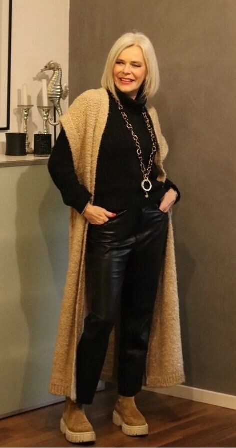 Чорні шкіряні штани прямого крою та вовняний светр із високим коміром виглядають досить стримано, але довгий жилет золотисто-бежевого кольору додає образу свіжості. Замшеві коричневі черевики на товстій підошві вдало доповнюють ансамбль.