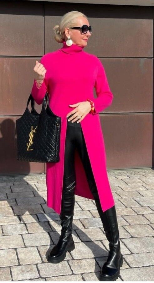 Яскраво-рожевий светр оригінального фасону з високим коміром та розрізом вище талії підкреслить вишуканий смак. В поєднанні з чорними вузькими шкіряними штанами та високими чоботами образ виглядає помітно, але не викликаюче.