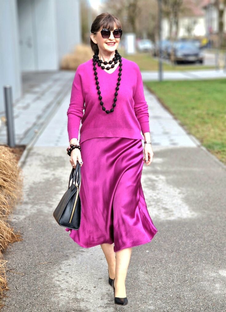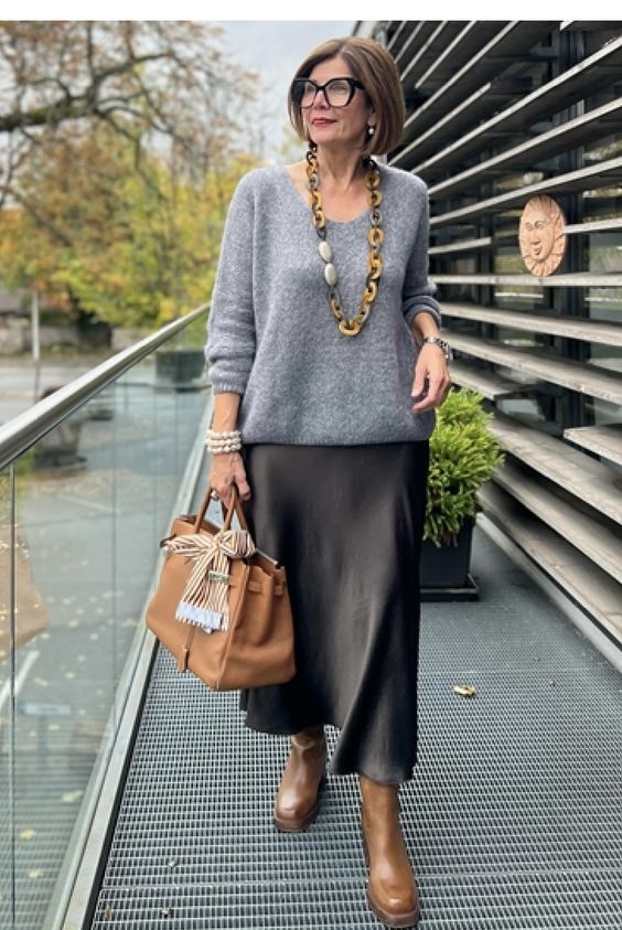 Спідниця-міді з шовку в темно-сірому відтінку та світло-сірий джемпер із V-подібним вирізом створюють витончене поєднання для зрілої жінки. Коричневі аксесуари – велика сумка та черевики челсі – додають ансамблю виразності. Завершить образ масивна прикраса на шиї.