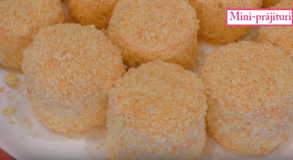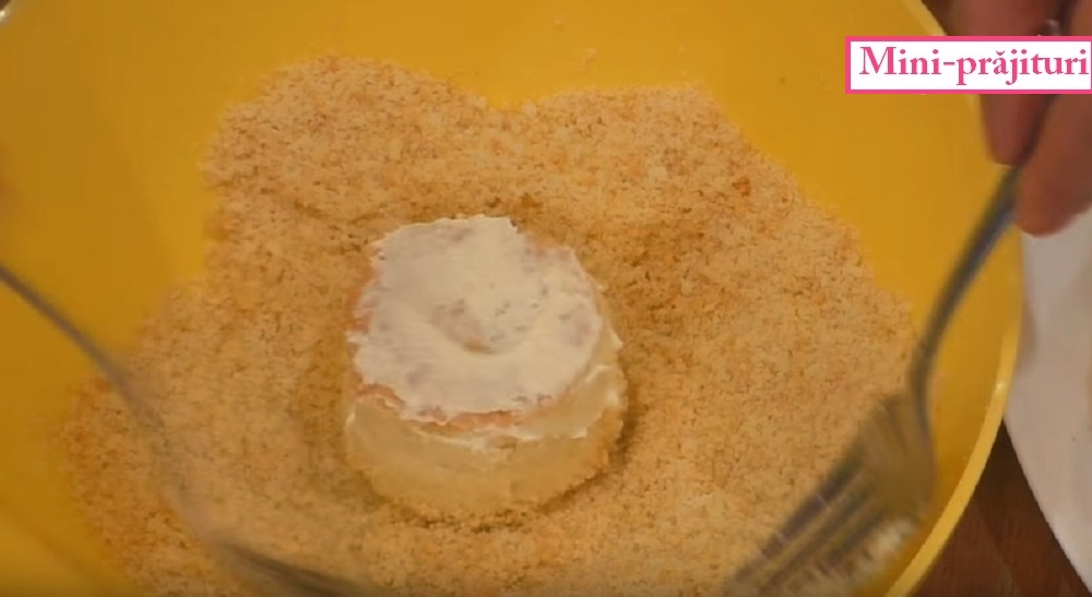 16. Краї і їх поверхню змастити кремом. Потім розкачайте їх у бісквітній крихті (за допомогою 2 виделок).