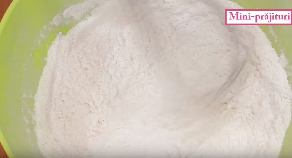 2. В окремій мисці з’єднайте просіяне борошно та розпушувач. Дуже добре перемішайте їх вінчиком.