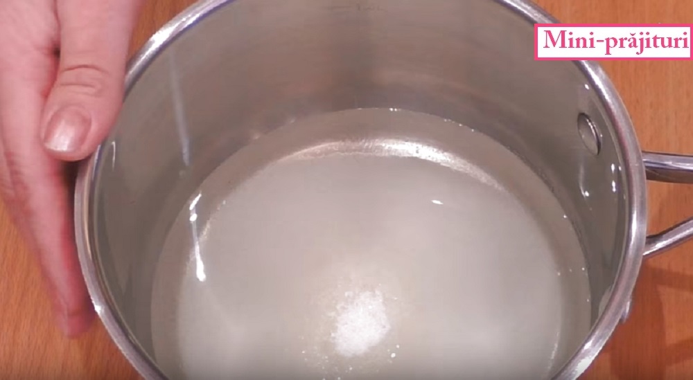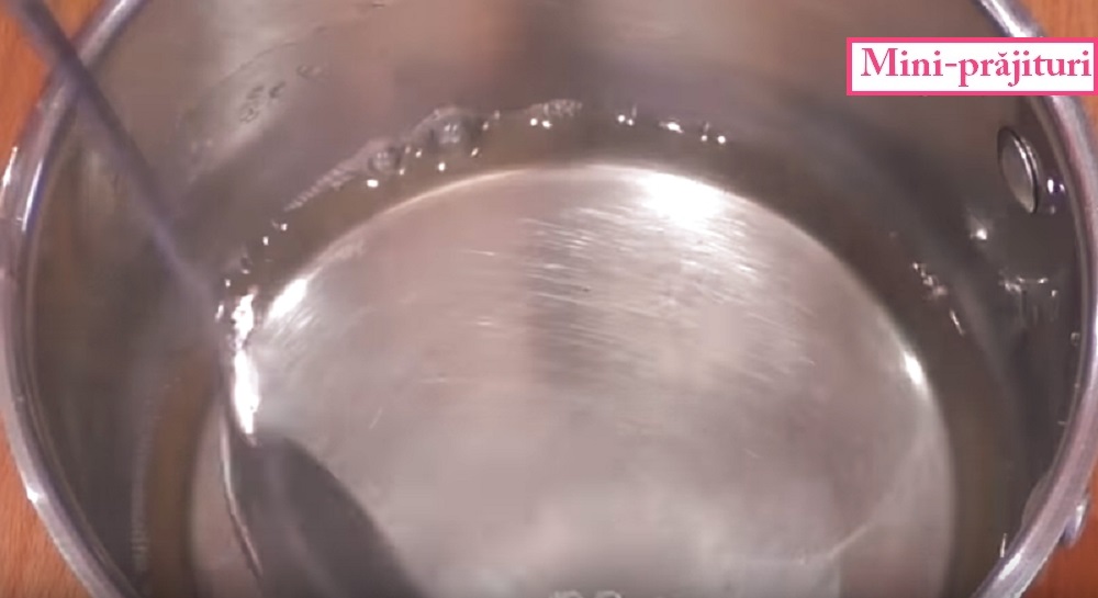 7. Поки бісквіт випікається, приготуйте цукровий сироп: змішайте в каструлі цукор і воду. Доведіть до кипіння і нагрівайте до повного розчинення цукру.